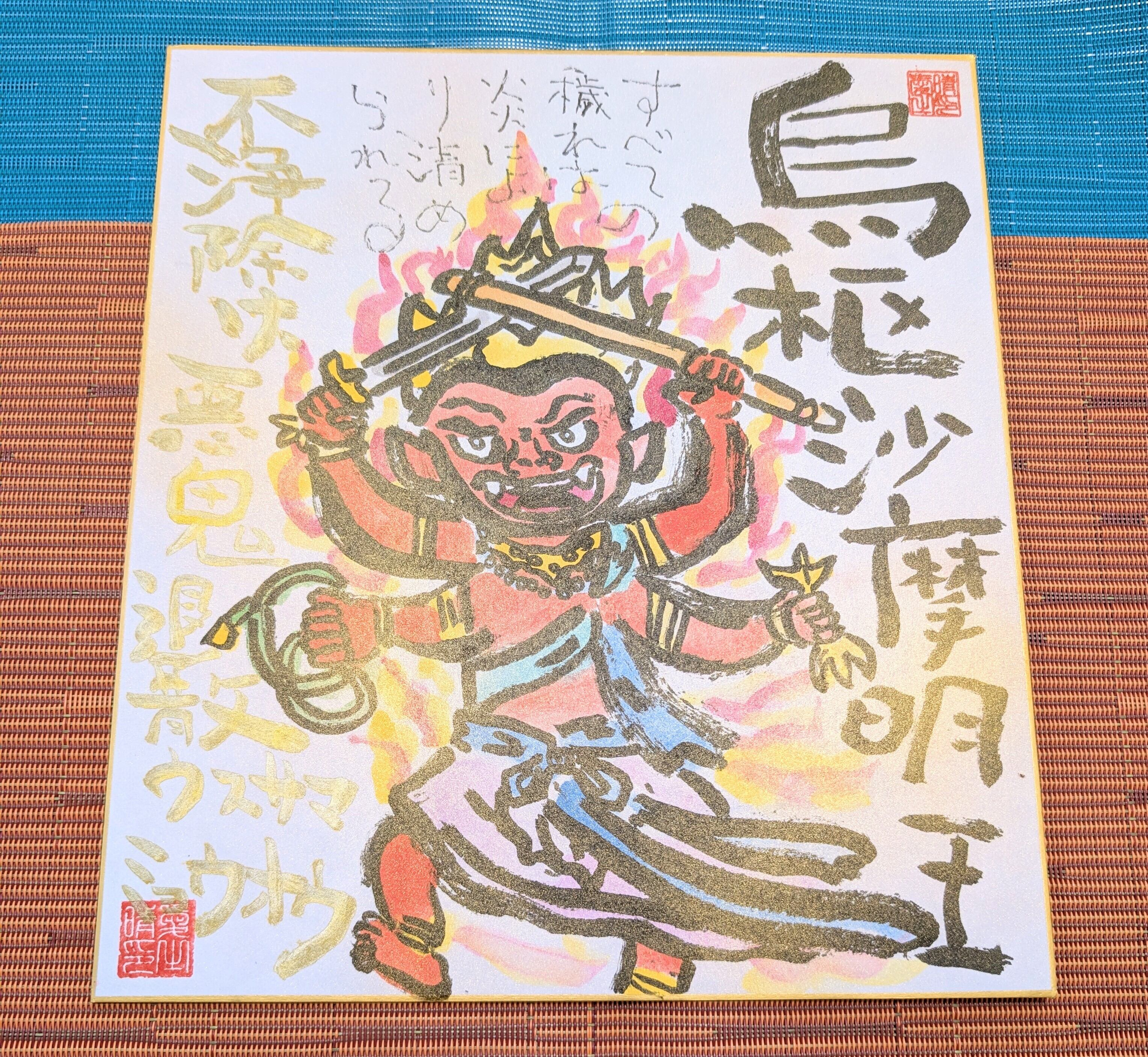 神仏筆文字作家「未来書」による作品「烏枢沙摩明王様」は、炎をまとい不浄を焼き尽くす力強い存在を、筆文字と色彩で表現した一点もののアートです。烏枢沙摩明王は古来より「浄化」「再生」「厄除け」の象徴とされ、特に目に見えない穢れや悪縁を断ち切り、心身を清らかな状態へと導く仏尊として信仰されてきました。