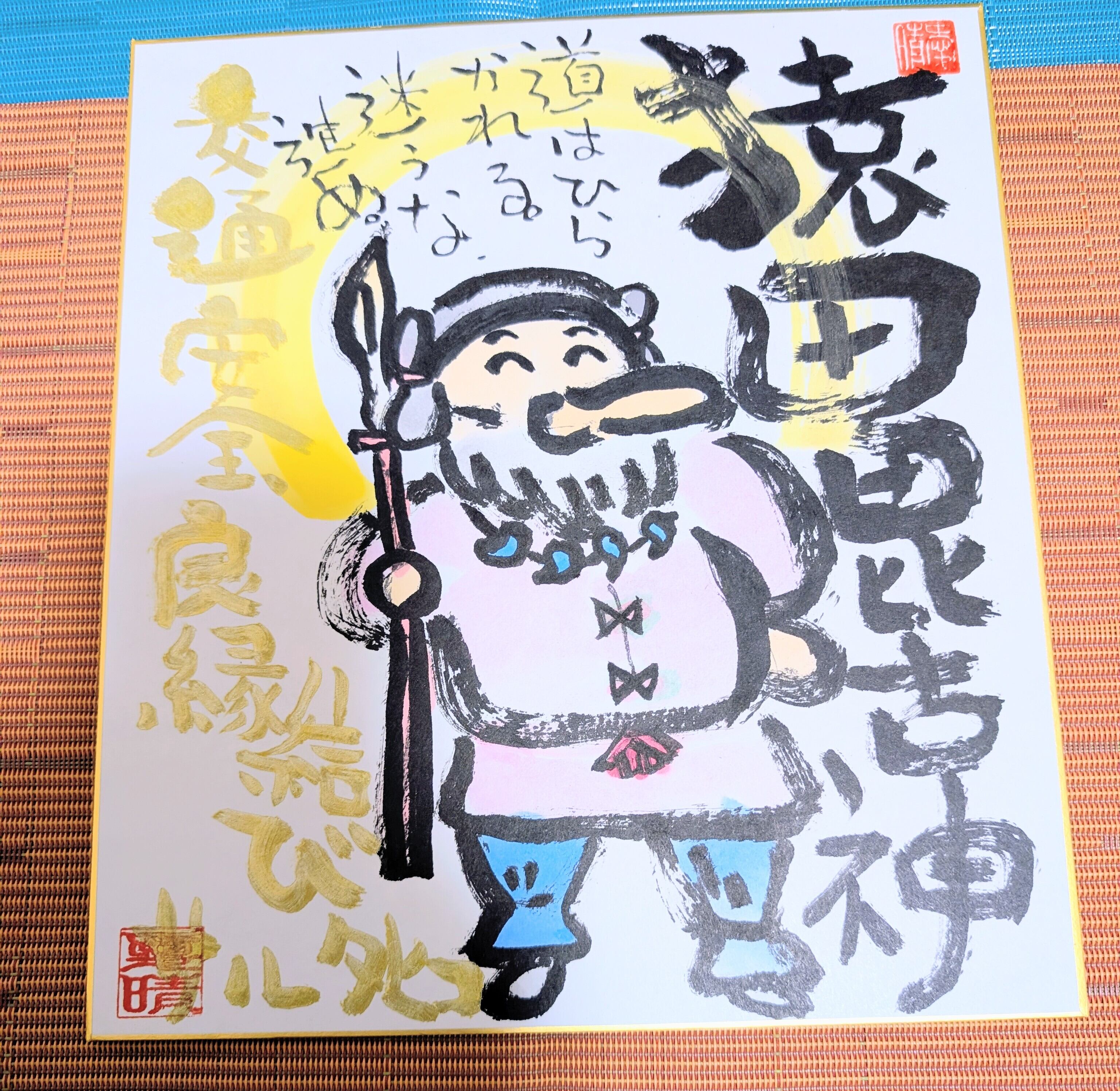 本作品は、筆アート心彩@神仏未来書による神仏筆文字作家作品「サルタヒコ」である。サルタヒコは日本神話において道開きの神として広く知られ、進むべき道を照らし、人々を正しい方向へ導く存在として古くから信仰されてきた。本作品では、その力強くも温かみのある神格を、筆文字と柔らかな彩色表現によって表現している。