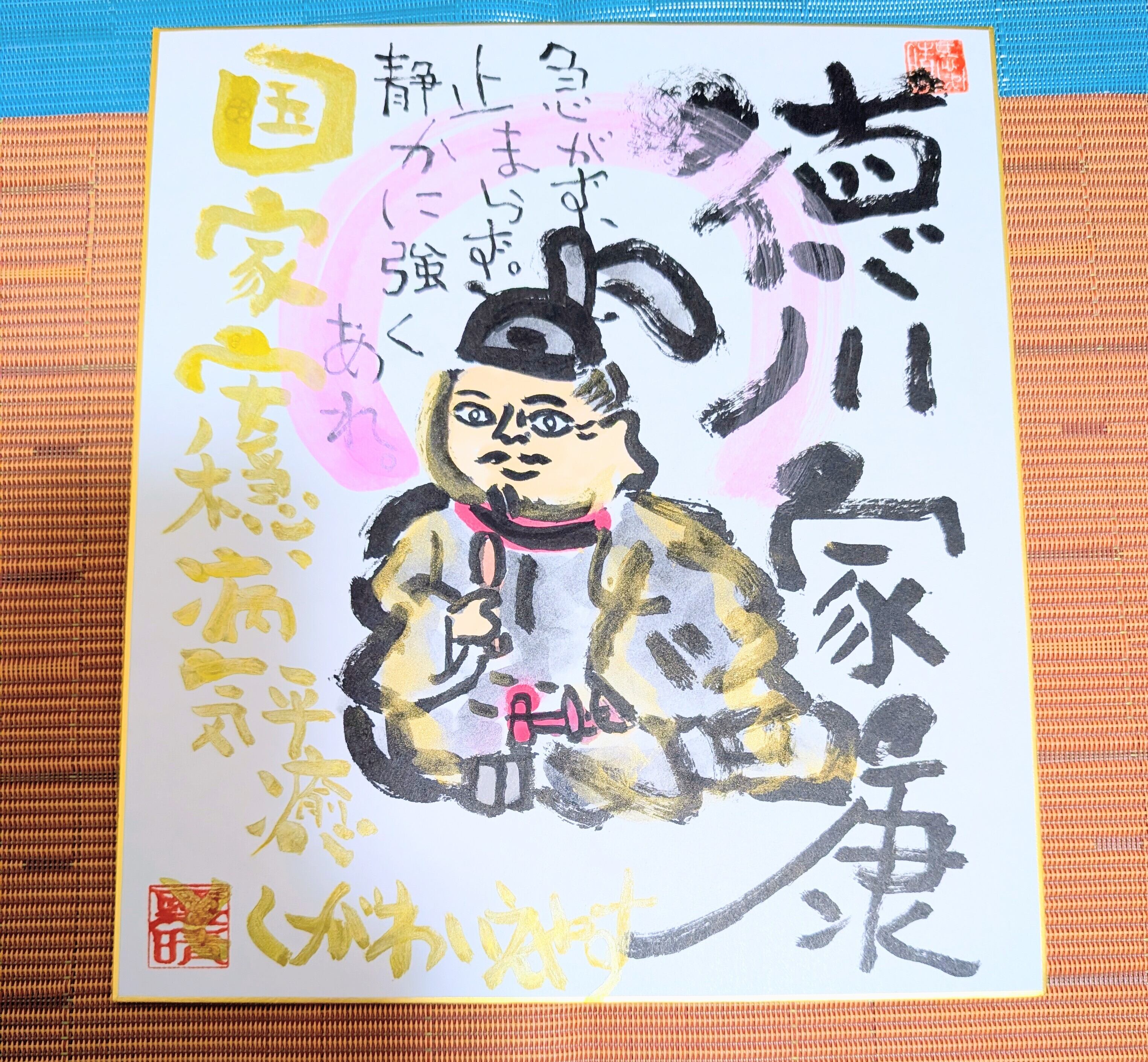 本作品は、筆アート心彩@神仏未来書による神仏筆文字作家作品「徳川家康」である。戦国の混乱を終息へと導き、江戸幕府を開いた徳川家康は、忍耐と知略、そして時を見極める力の象徴として広く知られている。本作品では、その家康公の精神性を、筆文字と彩色を融合させた独自の表現によって描き出している。